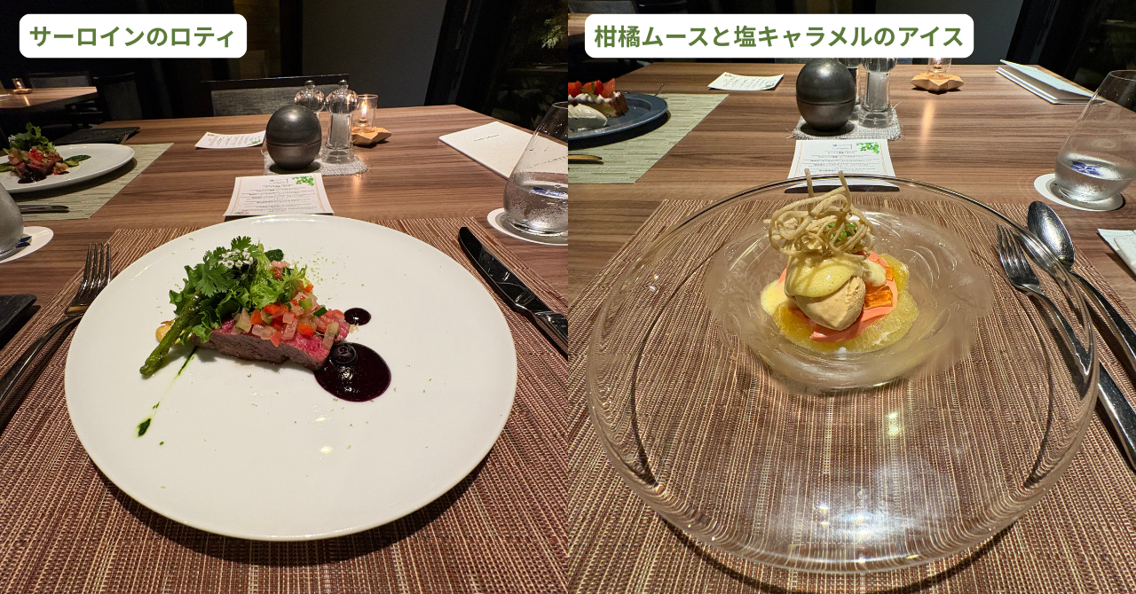 メインとデザートはそれぞれ2種類のメニューから選べるのですが、ゆりやんもしゅーやんもメインは牛サーロインを選びました。笑