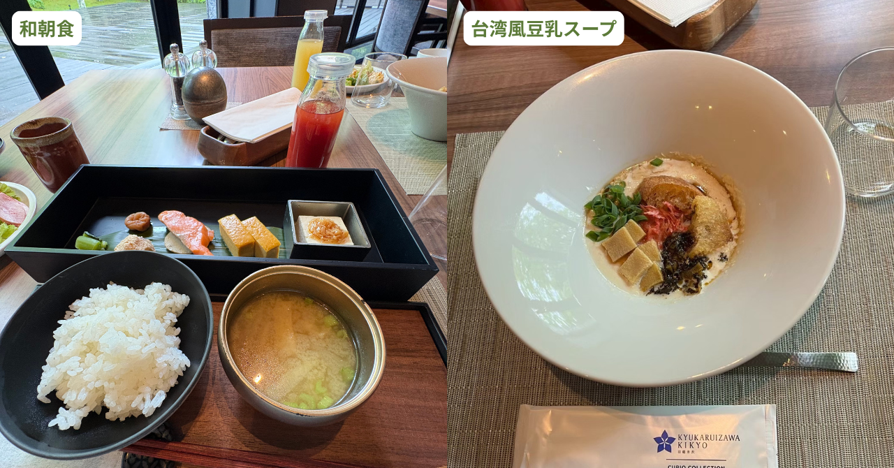 私たちが宿泊した、デラックスツインルームの様子や2食付きプランに含まれているコースディナーや美味しい朝食ブッフェの画像をまとめているので、旧軽井沢KIKYOへの宿泊を検討している方は、ぜひ参考にしてくださいね。